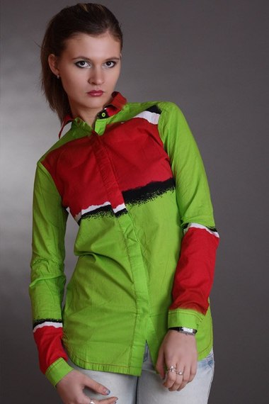 Необычное сочетание салатового и красного цветов приковывает взгляды, потайные пуговицы и классический воротничок - практичны!