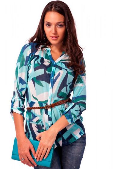 Блузка с ярким абстрактным рисунком в синих тонах.