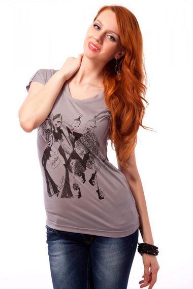 Футболка серо-коричневого цвета с изображением модниц. Модель имеет свободный покрой, короткие рукава и круглый вырез, переходящий в завязки на спине.