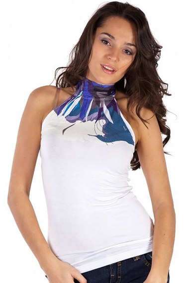 Стильный топ с открытыми плечами и бретелью-петлей через шею.