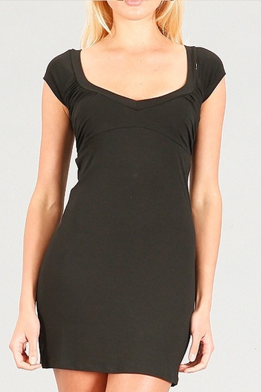 Простое повседневное платье из тонкой вискозы черного цвета. Модель длины "мини", облегающего силуэта с большим U- образным вырезом.