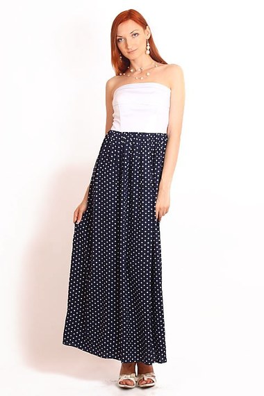 Тренд сезона - сарафаны в пол! Данная модель интересна тем, что верхняя часть сарафана представляет собой эластичный топ-бандо на резинке сзади, сшитый из белой ткани, а нижняя часть - свободная юбка клеш из темно синей ткани в белый горошек.