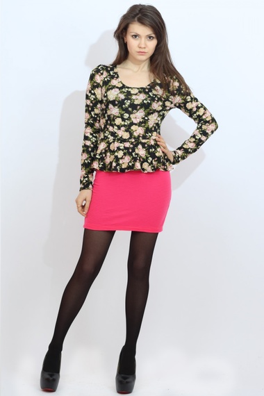 Веселое платье мини из трикотажа двух цветов: ярким розовым обозначена юбочная часть и нежными цветами на черном фоне выполнена верхняя часть в виде топа с баской.