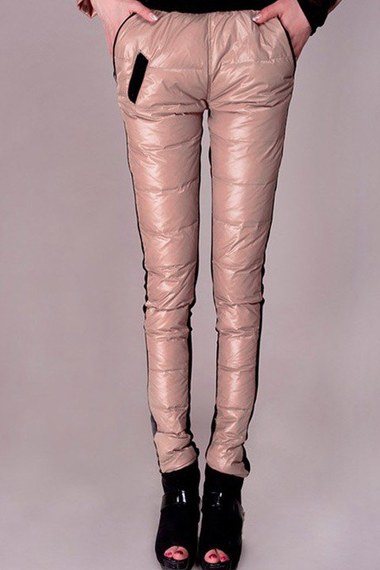 Балоневые брюки на резинке в спортивном стиле. Впереди модель выполнена из дутого материала бежевого цвета с контрастной отделкой карманов. Задняя сторона выполнена из черного мягкого материала.