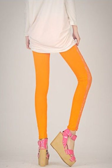 Яркие легинсы апельсинового цвета со вставкой из кружева. Модель облегающая, на поясе-резинке, сшита из тонкой вискозы.