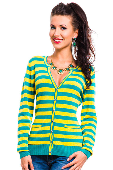 Яркий трикотажный жакет в желто-бирюзовую полоску, модель с глубоким V-образным вырезом и длинными рукавами, дополнен парой карманов и рядом пуговиц.