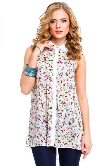 Удлиненная блузка с цветочным принтом спереди и однотонная белая сзади, задрапирована складками и украшена золотистой пуговицей. Отлично смотрится с темными джинсами!