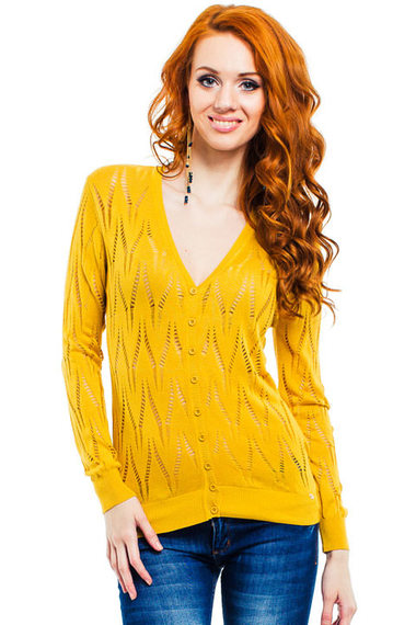 Жакет горчично-желтого цвета выполнен из тонкого трикотажа с ажурным рисунком, модель с длинными рукавами и V-образным вырезом, застегивается на ряд маленьких пуговичек.