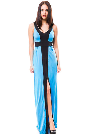 ОписаниеОчаровательное платье в пол, нежного голубого цвета с черными вставками подчеркивающие талию. V-образный вырез декольте и большой разрез спереди делает вас неотразимой. Платье сшито из высококачественного полотна и отлично переносит стирку.
