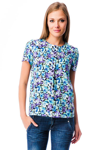 Нежная летняя блузка с коротким рукавом. Модель из вискозы с цветочным принтом в голубых тонах, посередине от горловины идет планка на пуговицах.