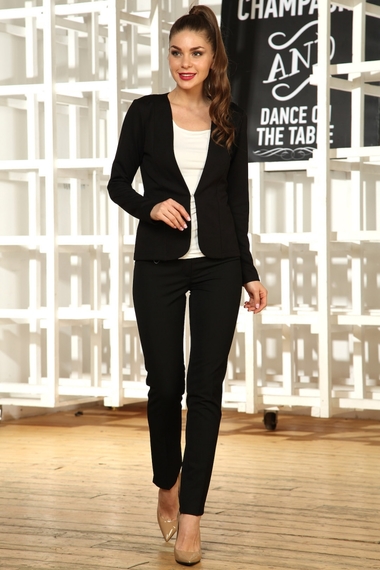 ОписаниеКлассический черный жакет с рукавами 3/4. Модель укороченная, без воротника, с застежкой на крючок.