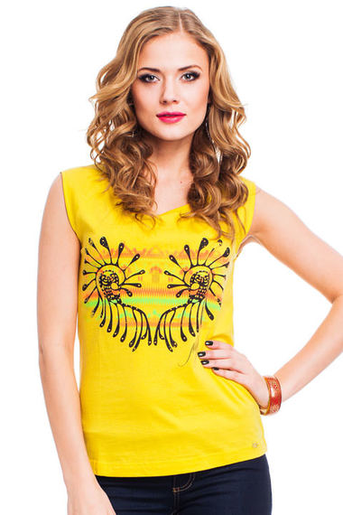 Яркая футболка на широких лямках. Сшита из хлопковой ткани желтого цвета, впереди украшена абстрактным принтом.