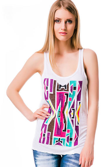 Хлопковая майка на длинных бретелях, с большой U-образной горловиной. Впереди цветной геометрический рисунок.