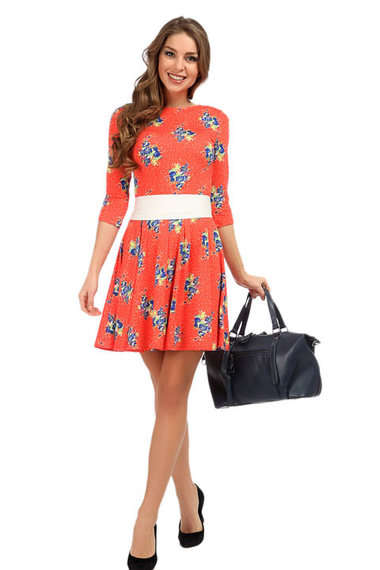 Милое платье из принтованой микрофибры оранжевого цвета. Модель приталенная, с расклешенной юбочной частью и рукавами 3/4. В комплекте с платьем идет длинный белый пояс.