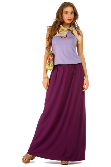 Длинное летнее платье из вискозы двух цветов% юбочная часть выполнена из ткани насыщенного фиолетового цвета, а топ выполнен из ткани фиалкового оттенка. Интересная деталь - вырез "капелька", по контуру отделанный тканью в тон к юбке.