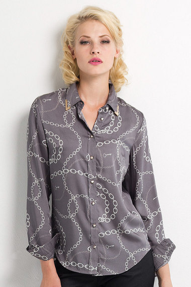 Серая женская рубашка с длинными рукавами и классическим воротником. Застегивается на пуговицы, имеет интересный контрастный принт  "цепи".