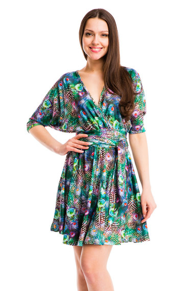 Фото товара 7015, зеленое платье на лето с принтом перо павлина
