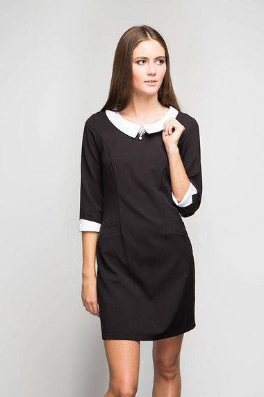 Очаровательное черное платье с белым воротником и манжетами. Модель средней длины, с рукавами 3/4. В комплекте съемная брошка!