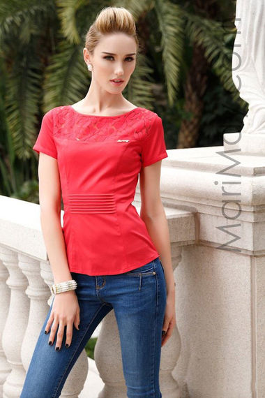 Нарядная и оригинальная блуза сочного красного цвета. Модель с коротким рукавом, имеет приталенный силуэт. Модель украшена ажурной вставкой спереди до линии груди и сзади по спинке. Спереди на талии отстрочка в виде горизонтальных полос. Легкая и воздушная модель блузки для торжественного случая или на каждый день.