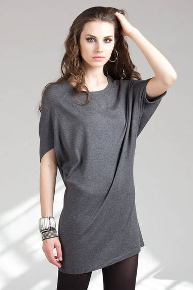 Теплый серый джемпер-туника длиной выше середины бедра. Модель свободного кроя, рукав реглан, округлый вырез горловины.