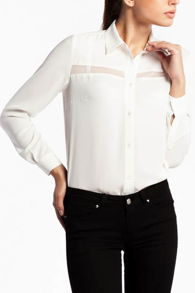 Нежная шифоновая блузка с длинными рукавами. Классическая модель с рубашечным воротником и манжетами на пуговице. Интересная деталь: полупрозрачные "окошечки" в области декольте.