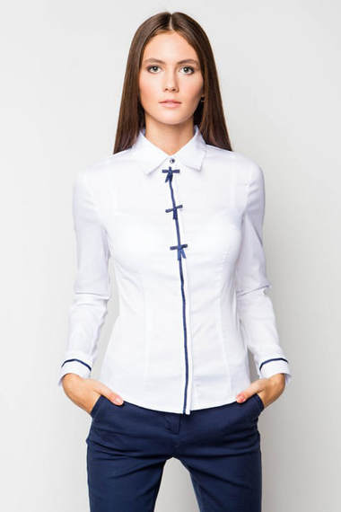 Стильная блузка с длинным рукавом. Модель из белой хлопковой ткани с оригинальным дизайном: отстрочка темно-синей лентой по передней планке и на манжетах рукавов, а так же три аккуратных бантика.