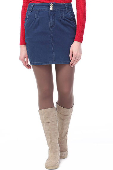 Синяя джинсовая юбка из эластичного хлопкового полотна. Модель до середины бедра, с карманами по бокам и застежкой на молнию впереди, пояс со шлевками под ремень.