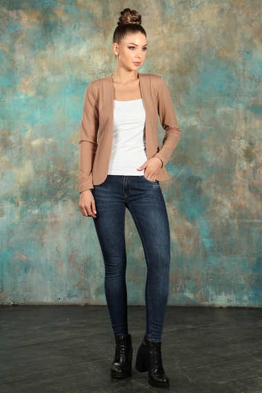 Жакет из однотонной ткани благородного цвета какао. Модель с глубоким вырезом и застежкой на два крючка.