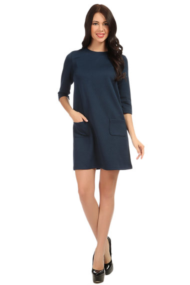 Повседневное платье темно синего цвета. Модель свободного кроя, с небольшими накладными карманами впереди на бедрах и рукавами 3/4.