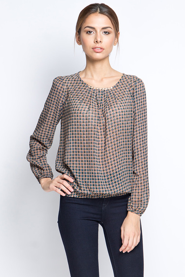 Блузка с длинным рукавом, выполнена из прозрачной струящейся ткани коричневого цвета. Низ модели дополнен резинкой. Спереди декоративная вставка из металлической золотой фурнитуры. Длинный рукав с резиновой манжетой.