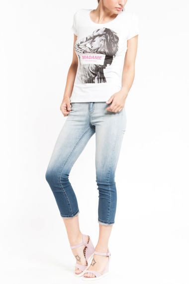Стильные джинсы с градиентом от голубого к синему. Модель облегающая, с укороченными брючинами и средней посадкой.