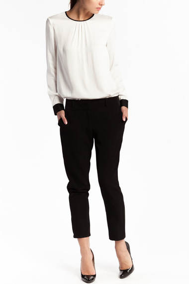Стильная блузка из вискозы молочного цвета, модель свободного покроя, по горловине и манжетам украшена контрастной черной отделкой, горловина имеет застежку сзади на пуговицу.
