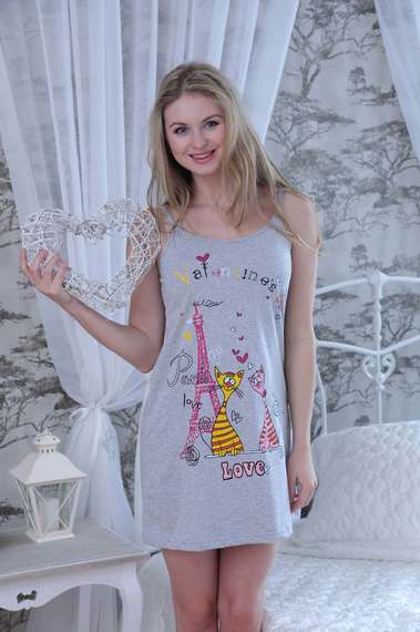 Простая сорочка серого цвета с принтом впереди. Модель свободного кроя, на тонких бретельках.