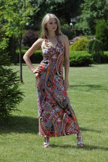 Уютный длинный сарафан с завязками на шее и открытой спиной. Сшит из трикотажа оранжевого цвета с принтом "турецкие огурцы".