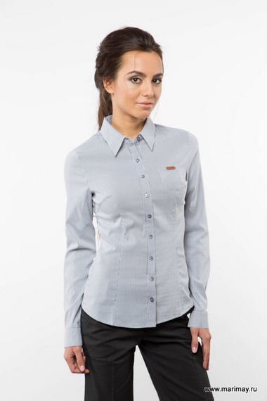 Классическая модель блузки в мелкую полосочку. Модель приталенная, пуговицы украшены стразами, на груди имеется небольшой карман.