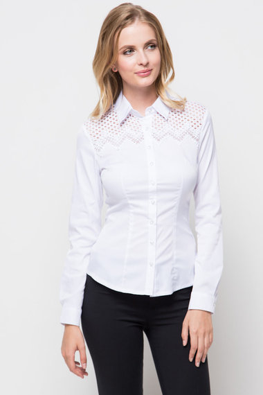 Классическая модель блузки белого цвета, с длинными рукавами, приталенного кроя. На плечах вставки из кружева с узором "ромб". Пуговицы украшены стразами.