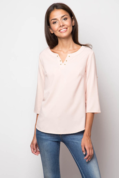 Нежная кремовая блузка с рукавами 3/4. Легкая и нежная текстура ткани напоминает шифон. Аккуратный V-образный вырез декорирован клепками