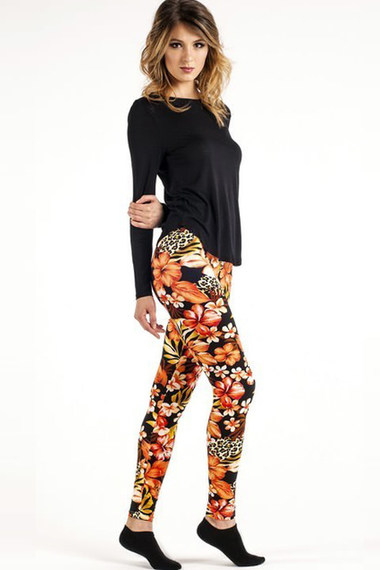 Яркие кроеные легинсы, выполнены из мягкой черной ткани с крупным цветочным принтом. Модель с удобной посадкой и талией на естественном месте.