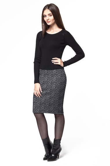 Интересное платье, которое выглядит как комплект: джемпер+юбка. Верхняя часть - черный вязаный трикотаж средней плотности, рукавами реглан, с эффектной отделкой по швам, а нижняя часть выполнена из плотного эластичного джерси серого цвета, с жаккардовым плетением. Джемпер с юбкой соединены простым эластичным швом.