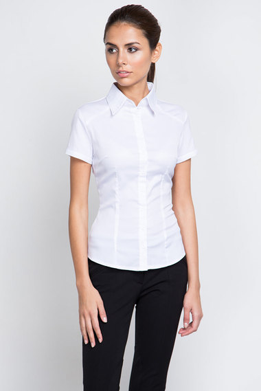 Простая белая блуза вделовом стиле. Модель приталенная, имеет вертикальные вытачки вдоль талии и классический воротник.