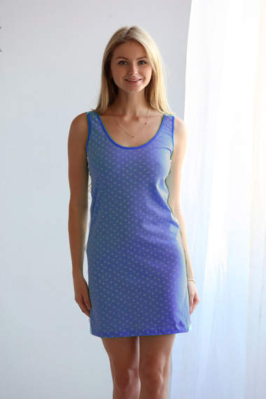 ОписаниеСиняя хлопковая сорочка для сна, модель свободного кроя, на широких лямках, сзади украшена тонкими бретельками крест на крест.