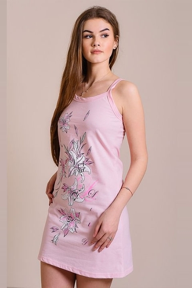 Розовая сорочка для сна, модель из хлопка,на широких бретельках, впереди принт "Лилии".