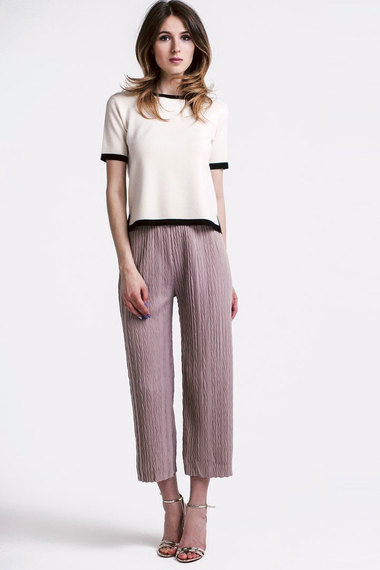 Широкие укороченные брюки - кюлоты цвета капучино, выполнены из плиссированной ткани "косичка" длиной 7/8. Сверху на резинке, талия на естественном месте.