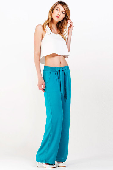 Летние брюки из легкой ткани цвета морской волны. Пояс на резинке, свободная посадка, функциональные боковые карманыи штанины внизу на завязках.