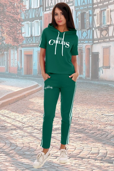 Детали одежды: укороченные брюки, пояс-резинка, небольшие кармашки, у толстовки капюшон