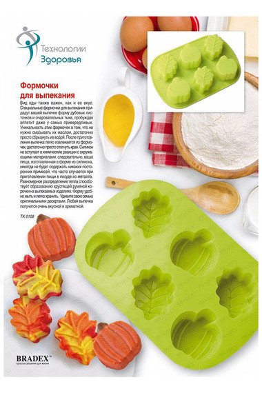Габариты товара: .21*0.175*0.025 Вид еды также важен, как и ее вкус. Неряшливо оформленное блюдо порой способно даже отбить аппетит. Специальные формочки для выпекания придадут печенью форму дубовых листочков и очаровательных тыкв, пробуждая аппетит даже у самых привередливых. Удивите свою семью оригинальными десертами. ПРИМЕНЕНИЕ: Рецепт: 200 г сливочного масла или маргарина 150 г сахара 2 ч.л. ванильного сахара 4 яйца 300 г ягоды можно замороженные 2 ч.л. разрыхлителя (или 1 ч.л. гашеной соды) 300-350 г муки Приготовление Масло растереть с сахаром и ванильным сахаром. Добавить яйца, перемешать. Добавить ягоды, перемешать (если Вы используете чернику, она окрасит тесто в синий цвет). Добавить разрыхлитель и муку, замесить не очень крутое тесто. Формочки немного смазать растительным маслом (силиконовые формочки смазывать не надо), выложить тесто, заполняя формочки на 2/3 высоты. Поставить в разогретую до 180 градусов духовку. Выпекать в течение 25-30 минут.