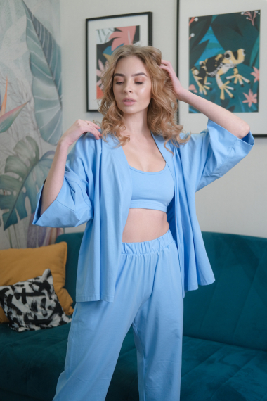Хлопковый трикотаж премиум-класса, не скатывается и не садится при стирке. В серии Home идеально сочетаются топ, кимоно и брюки. Вы можете выбрать все позиции в одном оттенке или поиграть с сочетанием различных цветов.