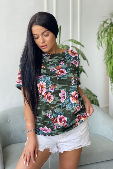 Фото товара 22859, женская зеленая свободная футболка с цветами