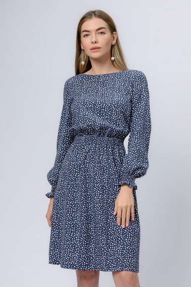 Платье синее в мелкий горошек и длинными рукавами 1001 DRESS