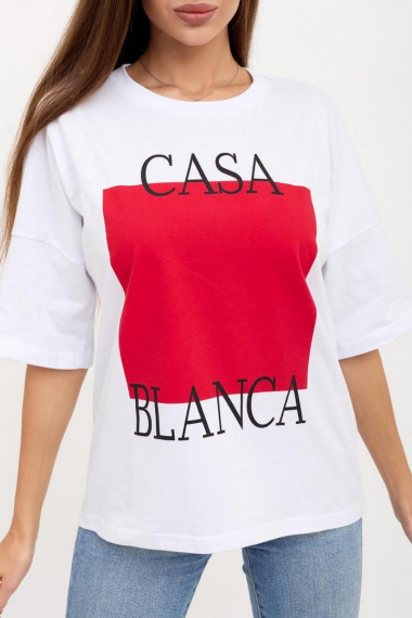 Фото товара 23975, женская белая футболка оверсайз с ярким принтом каса бланка